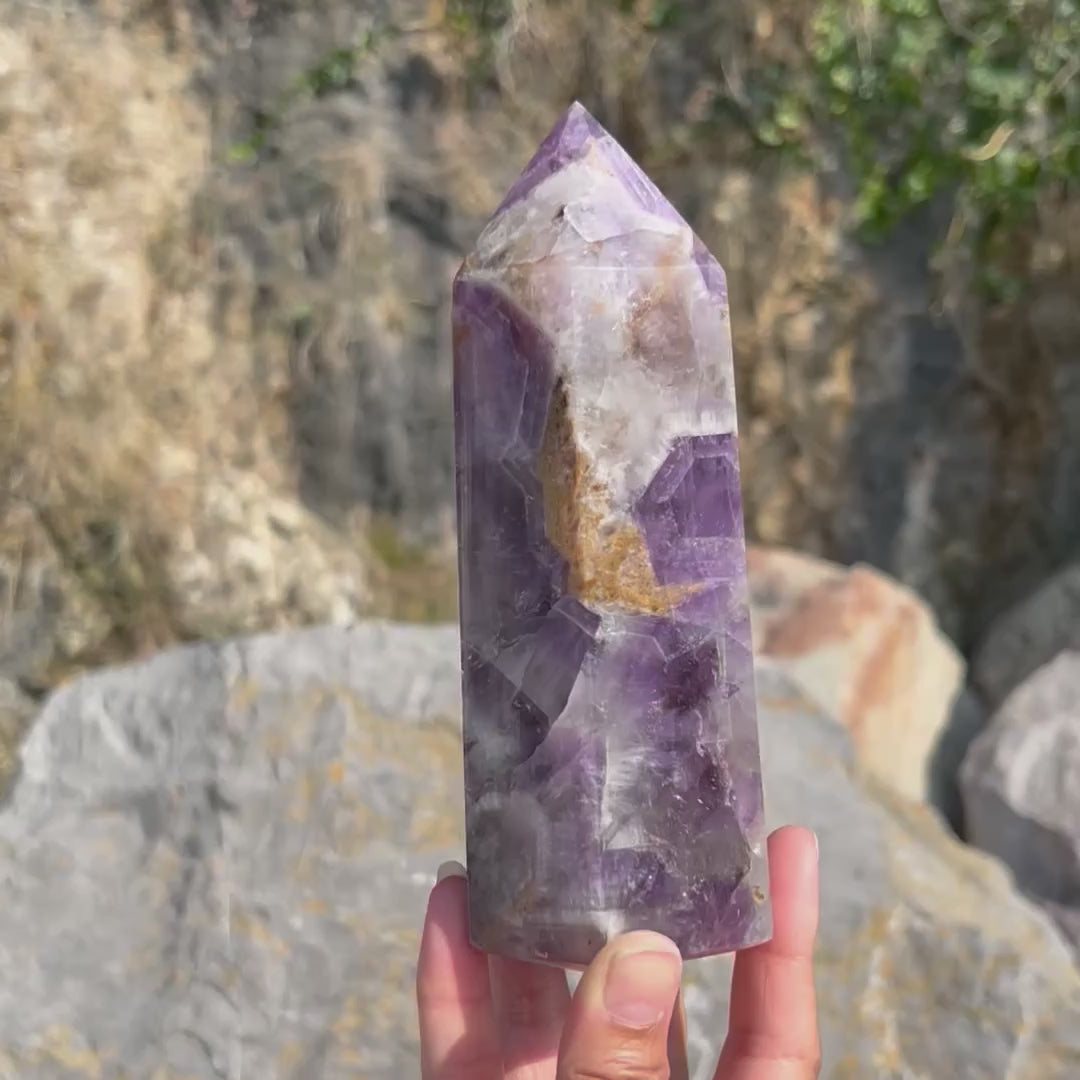 A beautifully carved Madagascan Dream Amethyst tower to calm your mind and uplift your spirit. Blending amethyst and white quartz, it enhances intuition and emotional clarity. Perfect for meditation, restful sleep, and harmonising your energy.