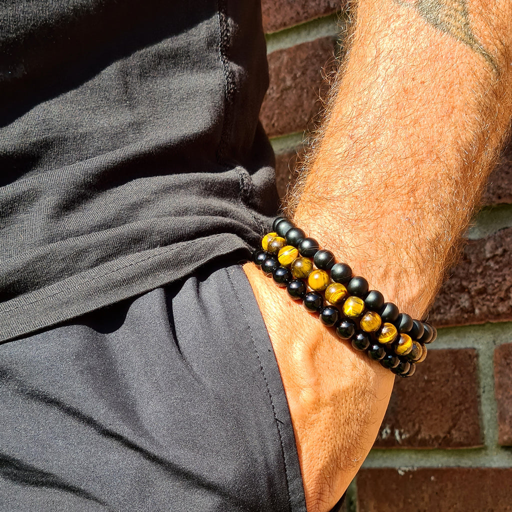 A striking beaded energy bracelet featuring 8mm Tiger Eye gemstones. Stainless Steel accessory detail. Our Essential Collection is perfect for everyday wear. Team with our Onyx Essential energy bracelets for a combination of strength, good fortune and positivity.